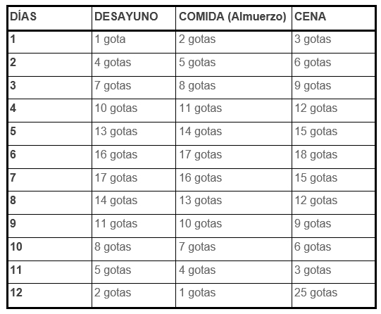 A partir del trigésimo día, tomaremos 25 gotas tres veces al día hasta terminar el preparado.